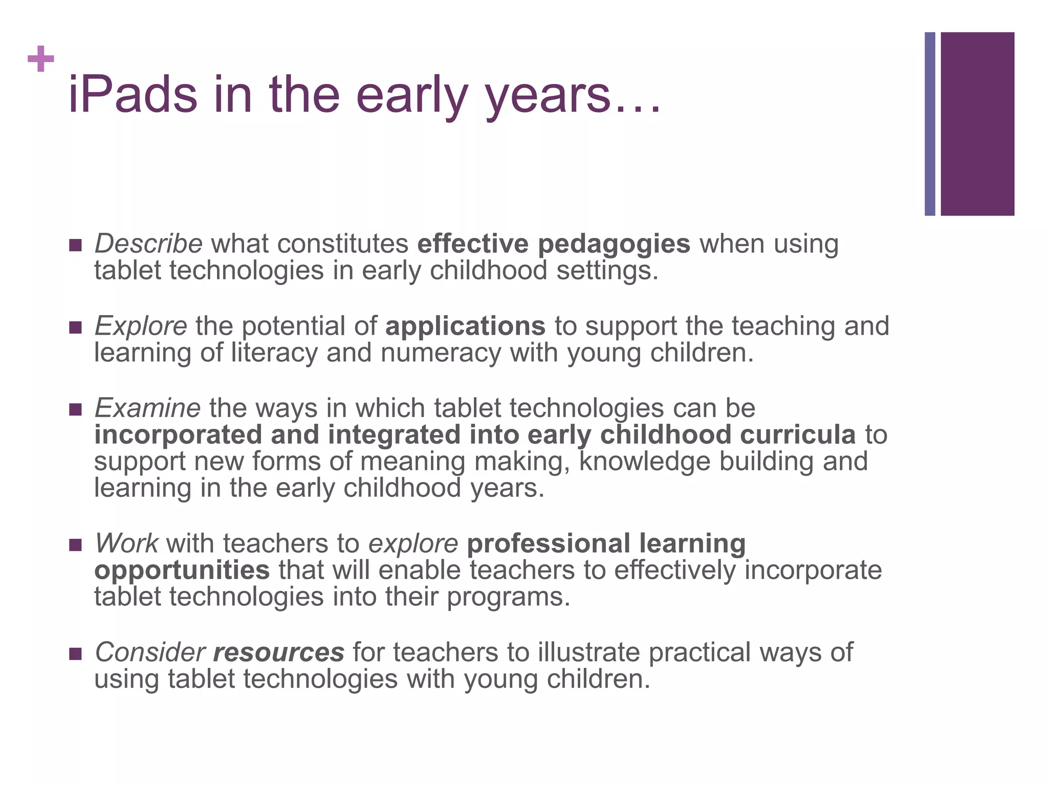 This document discusses the effective use of tablet technologies, specifically iPads, in early childhood education settings to enhance literacy and numeracy learning. It highlights the importance of teacher philosophy, confidence, and professional development in integrating these technologies, as well as various pedagogical models like SAMR for effective implementation. Additionally, it emphasizes the need for leadership and access to resources for teachers to fully utilize tablets in teaching young children.
