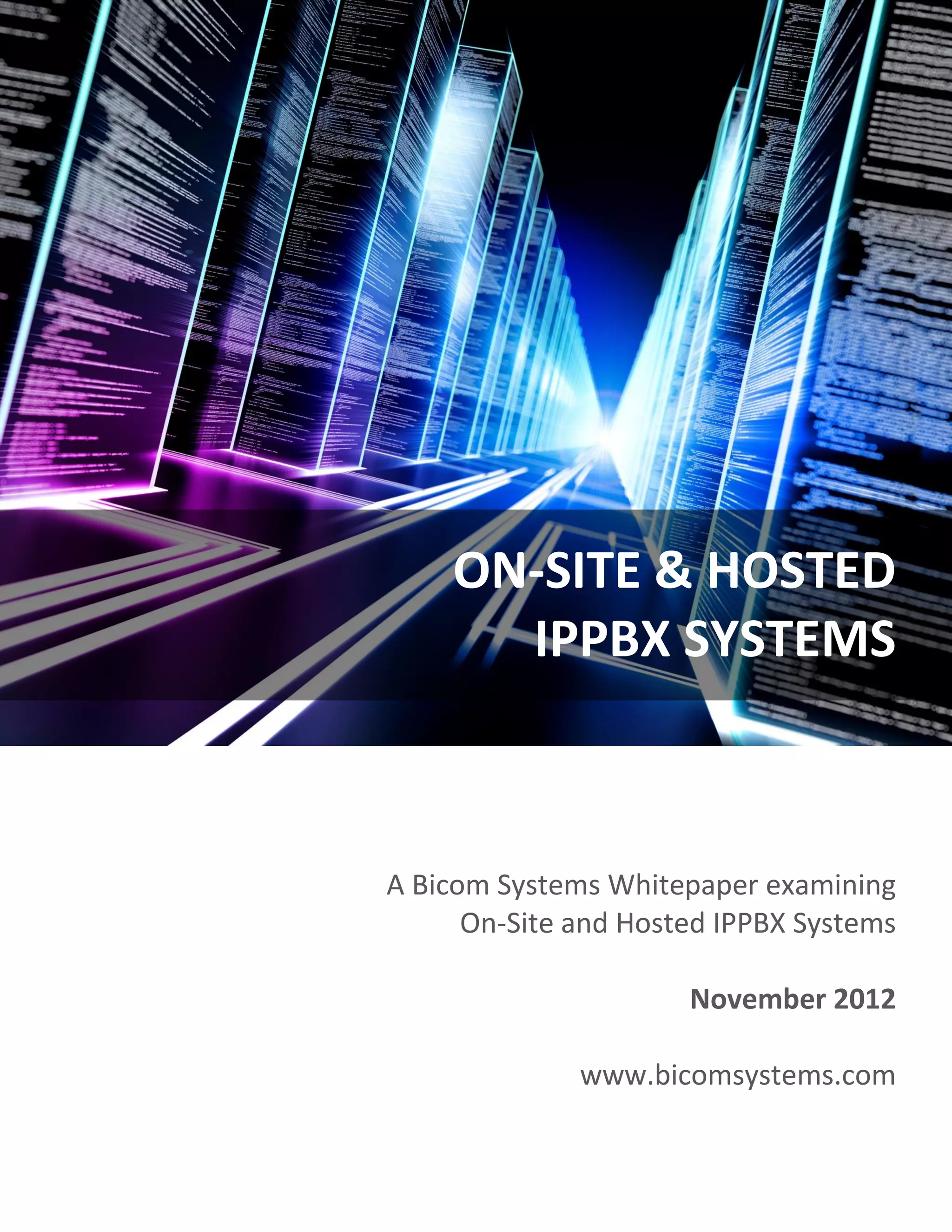 The document discusses on-site and hosted IPPBX systems. On-site systems involve purchasing and installing equipment on the user's premises, while hosted systems are cloud-based solutions managed remotely by a service provider. Both have advantages - on-site systems give users more control but are more expensive up front, while hosted systems are cheaper and lower maintenance but users have less control. The document provides examples of when different solutions may be appropriate based on a company's needs. It also outlines factors like ROI calculators, performance, and security that providers can highlight to help users determine the best option.