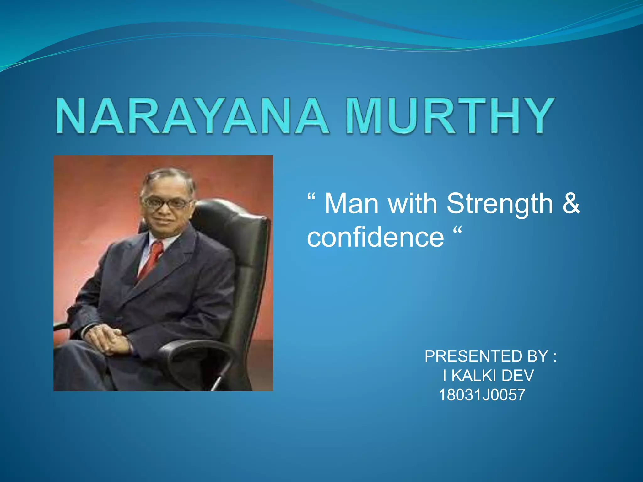 N.R. Narayana Murthy is an Indian business leader who co-founded Infosys, one of India's largest IT companies. He served as CEO from 1981-2002 and Chairman from 2002-2011. Murthy obtained engineering degrees and worked in software before starting Infosys in 1981 with $250. Under his leadership, Infosys grew from 7 people to a global IT giant listed on NASDAQ. Murthy is recognized with numerous honors for his entrepreneurship and contributions to India's rise as an IT leader. His leadership style focused on honesty, loyalty and empowering employees.