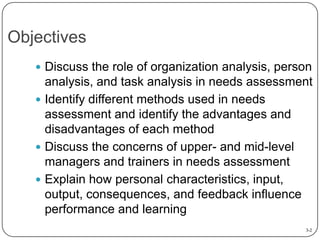 The document summarizes key aspects of conducting a needs assessment for training programs. It discusses using organization analysis, person analysis, and task analysis to determine training needs. Methods of needs assessment include interviews, surveys, focus groups, and reviewing performance data. The needs assessment process identifies performance gaps, who needs training, training objectives, and evaluation methods. It also addresses analyzing employee characteristics like skills, motivation, and job fit to ensure training readiness and success.