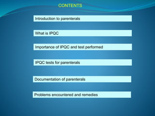 The document discusses in-process quality control (IPQC) for parenteral products. IPQC involves controlling manufacturing procedures from raw materials to finished product release. Key IPQC tests for parenterals include clarity testing to detect particulate matter using visual or automated methods, leakage testing of packaging, testing fill volume and pH, and sterility testing. The document outlines various physical, chemical, biological, and microbiological tests performed during IPQC to ensure product quality.