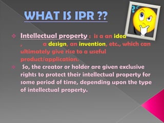 The document summarizes India's intellectual property laws. It outlines that India's patent system originated from the 1856 Act of Protection of Inventions and the 1872 Patents and Designs Protection Act. The key IP laws currently in India are the Indian Patent Act of 1970, the Indian Patent and Designs Act of 1958, and the Copyright Act of 1957 as amended in 1999. The document then provides details on patents, copyrights, trademarks, trade secrets, geographical indications, and designs including requirements, duration of protection, and registration processes in India. It discusses advantages and disadvantages of IPR and concludes that IPR provides opportunities for innovation and economic development while also raising some competition issues.