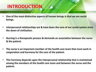 This document discusses interpersonal relationships in nursing. It defines interpersonal relationships as reciprocal interactions between individuals that involve sharing goals and interests. The document outlines Peplau's model of the nurse-patient relationship, which includes four phases: preinteraction, orientation, working, and termination. It describes the goals and processes of each phase. Additionally, the document lists principles for maintaining interpersonal relationships, such as respecting individuality and keeping emotions in check. It discusses characteristics like trust and empathy that facilitate positive relationships and barriers that can interfere with relationships, such as cultural differences or lack of time.