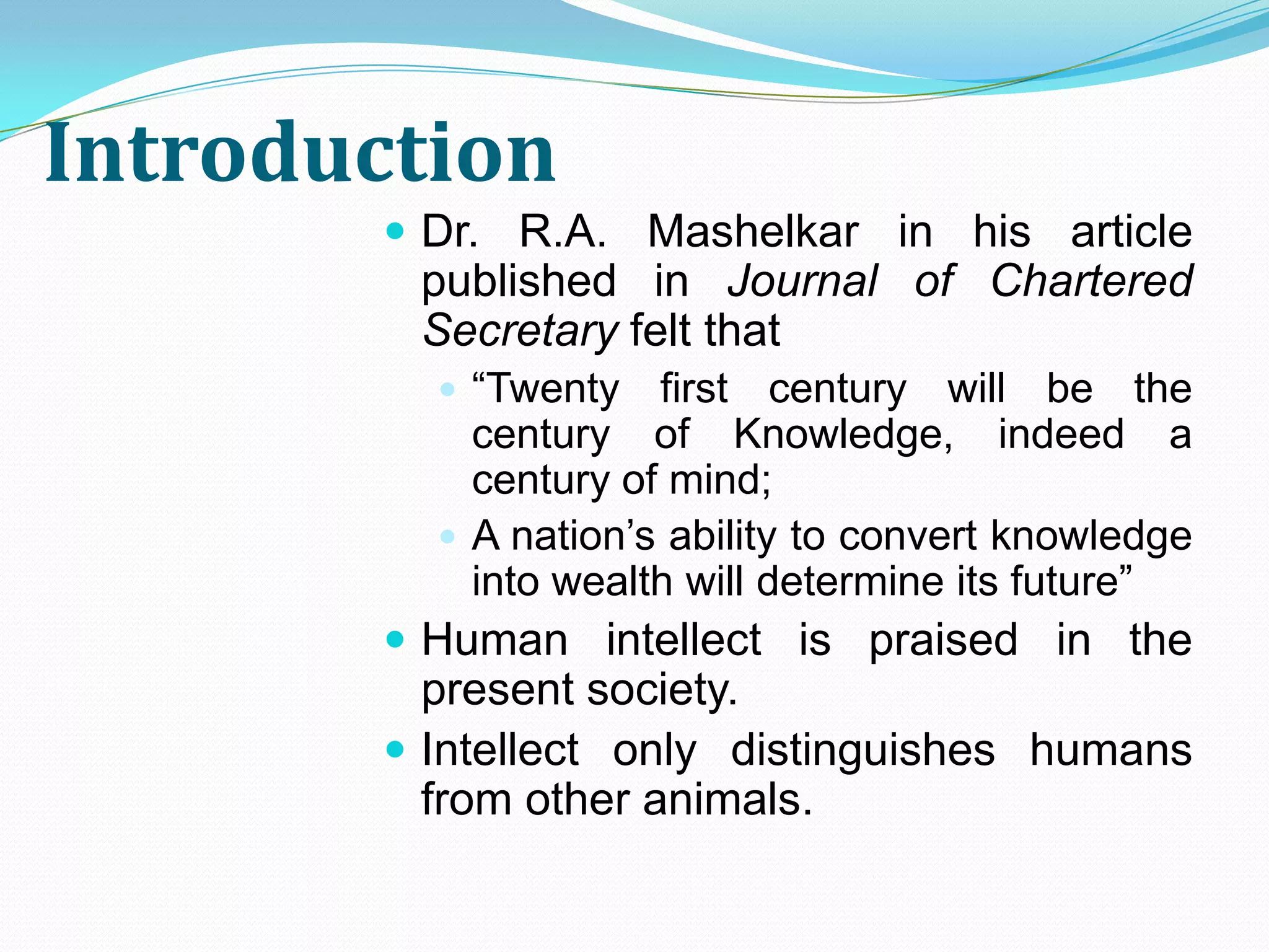 Dr. R.A. Mashelkar believes the 21st century will value knowledge and human intellect. Intellectual property (IP) arises from human mental activity and ideas. IP can be protected through various forms including patents, trademarks, copyrights, and industrial designs. The World Intellectual Property Organization was established to harmonize IP laws globally and facilitate international protection of creations. Copyright specifically protects original works of authorship from unauthorized copying and distribution.