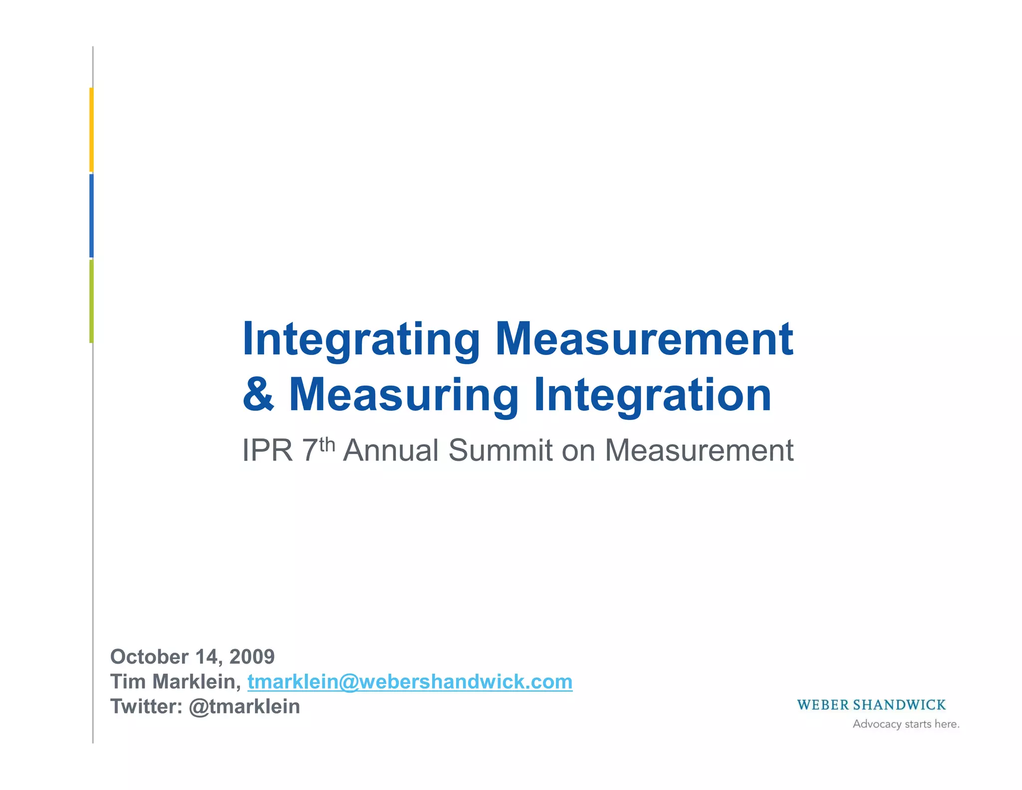 The document discusses the importance of integrating measurement in public relations (PR) to align with business metrics and improve decision-making. It highlights challenges such as the lack of accountability in PR metrics and the need for more comprehensive data integration across various communication disciplines. The author emphasizes that effective measurement and integration of traditional and digital media are essential for PR professionals to demonstrate their value and influence business outcomes.