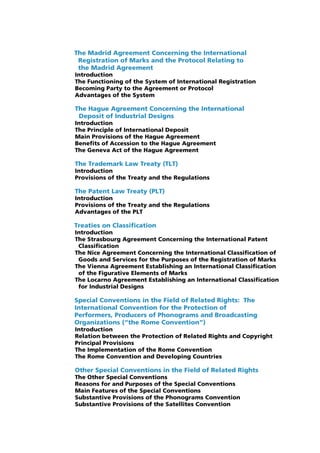 - Other agreements such as the Patent Cooperation Treaty, Budapest Treaty, Madrid Agreement, Hague Agreement, and TRIPS agreement, which established international systems for patents, microorganisms, trademarks, industrial designs, and intellectual property standards.