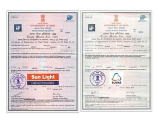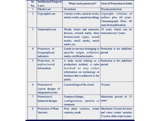 The document discusses various types of intellectual property rights (IPRs), categorizing them into industrial property rights and copyright, and highlighting their importance in encouraging innovation and protecting creators' rights. Key types of IPR include patents, trademarks, industrial designs, geographical indications, and trade secrets, each with distinct definitions and examples. Additionally, it elaborates on the significance of these rights in commercial contexts and provides specific instances from fields like pharmaceuticals, art, and agriculture.