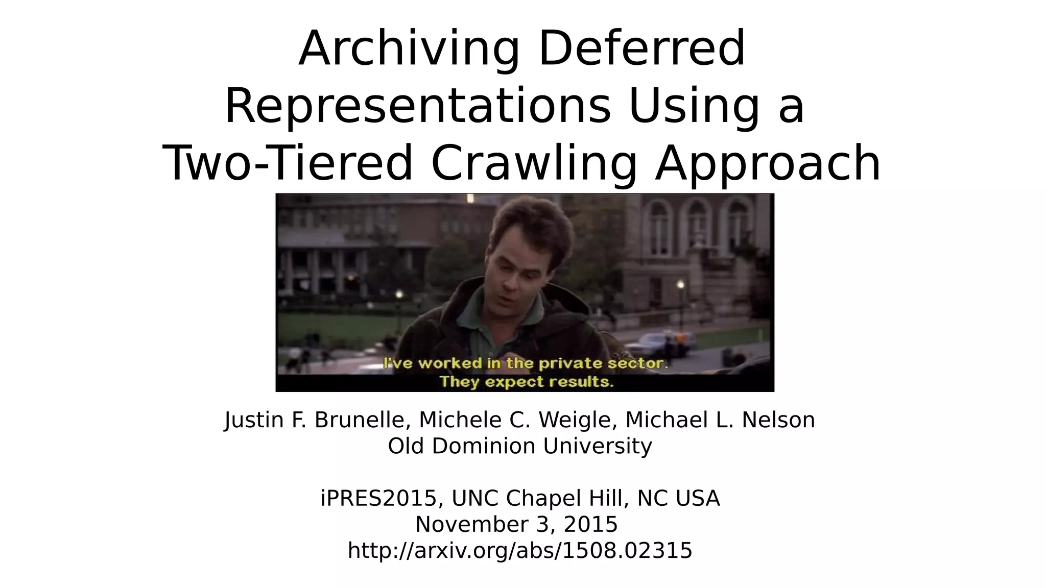 This document proposes a two-tiered crawling approach using PhantomJS and Heritrix to better archive deferred representations, which are web pages that require JavaScript execution or user interaction to fully render. The approach uses PhantomJS to execute JavaScript and interact with deferred representations, while Heritrix crawls non-deferred representations for better performance. Test results found the PhantomJS frontier was 1.5 times larger but crawling was 10.5 times slower. The approach provides a better method for archiving deferred representations compared to the current workflow.