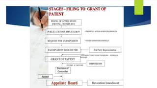 The document discusses various aspects of intellectual property rights including patents, trademarks, copyrights and related terms. Some key points: