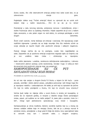 Emocije imaju značajan uticaj na naše zdravlje, a negativna emocionalna iskustva mogu pogoršati fizičko stanje. Važno je oslanjati se na pozitivne emocije kako bismo unaprijedili svoje zdravlje i samopouzdanje, a promjene u životu često zahtijevaju hrabrost. Samosvest i rad na ličnim ciljevima ključni su za ostvarenje pozitivne promene i lični razvoj.