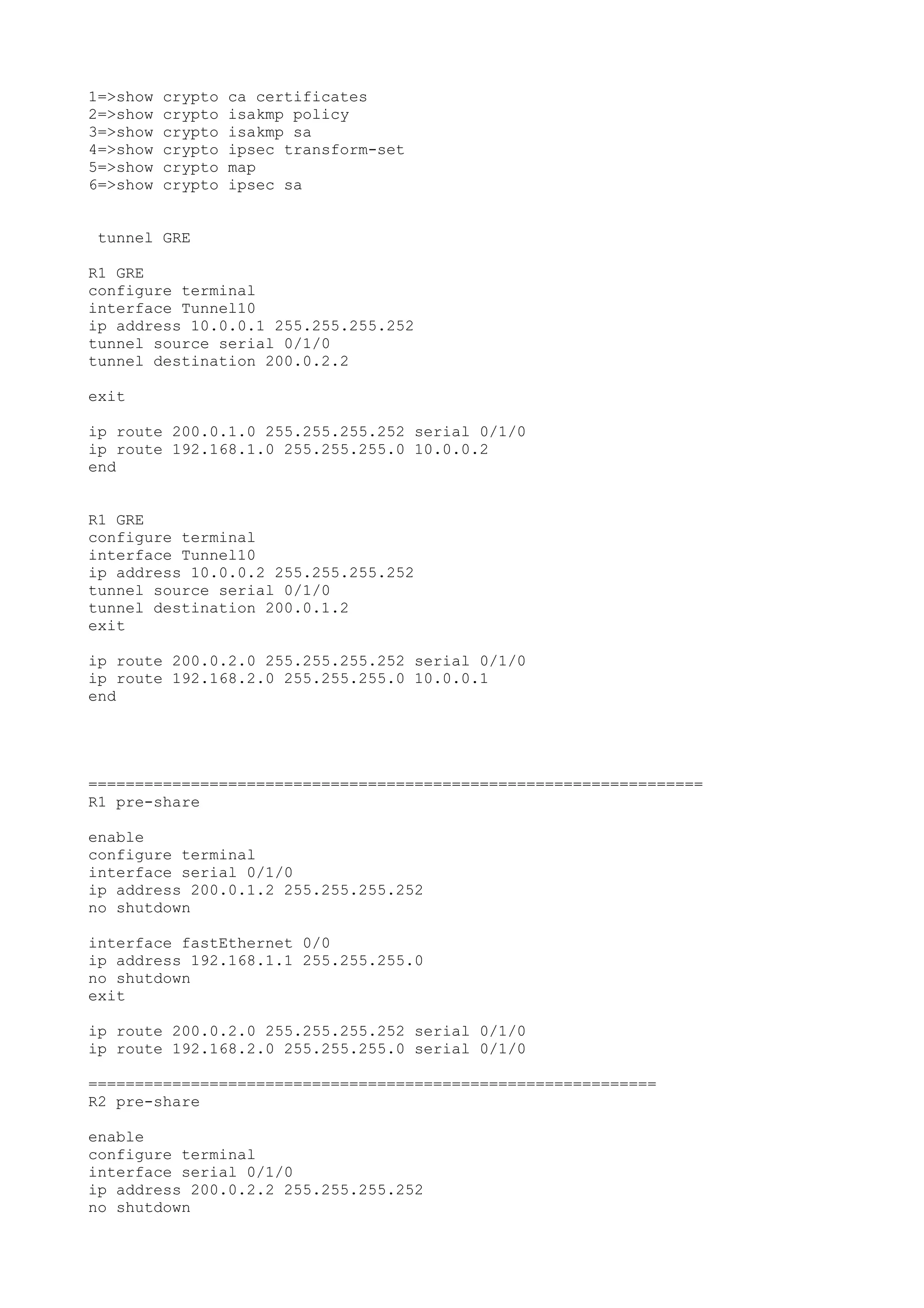 The document describes the configuration of two routers, R1 and R2, to establish an IPsec VPN using pre-shared keys for authentication. It then shows the configuration of a Certificate Authority (CA) and the enrollment of certificates on R1 and R2 to authenticate the IPsec tunnel using RSA signatures instead of pre-shared keys. Access control lists (ACLs) and crypto maps are used to define the traffic to protect and apply the IPsec policies.