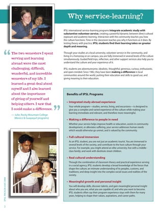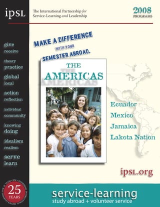 The document describes the International Partnership for Service-Learning and Leadership (IPSL) programs, which integrate academic study, volunteer service, and cultural immersion. IPSL programs provide students opportunities to make a difference through service, gain a deep understanding of other cultures, and facilitate personal and intellectual growth. Students are immersed in multiple levels of the host culture through university study, community service placements, homestays, and cultural excursions.