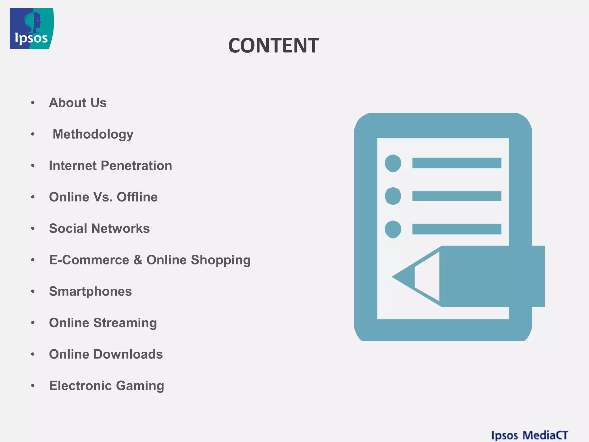 This document summarizes internet usage and consumption habits in the Middle East and North Africa region based on surveys conducted by Ipsos. It finds that internet penetration varies significantly across countries, ranging from over 75% in the UAE to 23% in Iraq. Social media usage is widespread, led by Facebook, YouTube, and Instagram. E-commerce is most developed in the UAE, where 46% of internet users shop online, compared to just 8-9% in Egypt and Lebanon. Streaming services and online gaming are also growing behaviors among youth in the region.