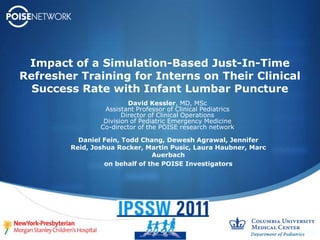 The study examines the effectiveness of simulation-based mastery education (SBME) and just-in-time (JIT) refresher training on pediatric interns' success rate in performing infant lumbar punctures. Results showed no significant improvement in clinical success rates with the combination of SBME and JIT training compared to SBME alone. The research indicates future directions focusing on bedside competency assessments and increased self-directed practice opportunities.