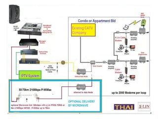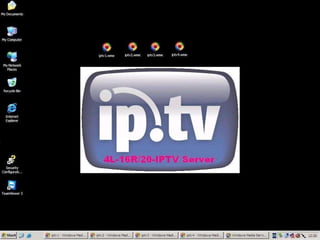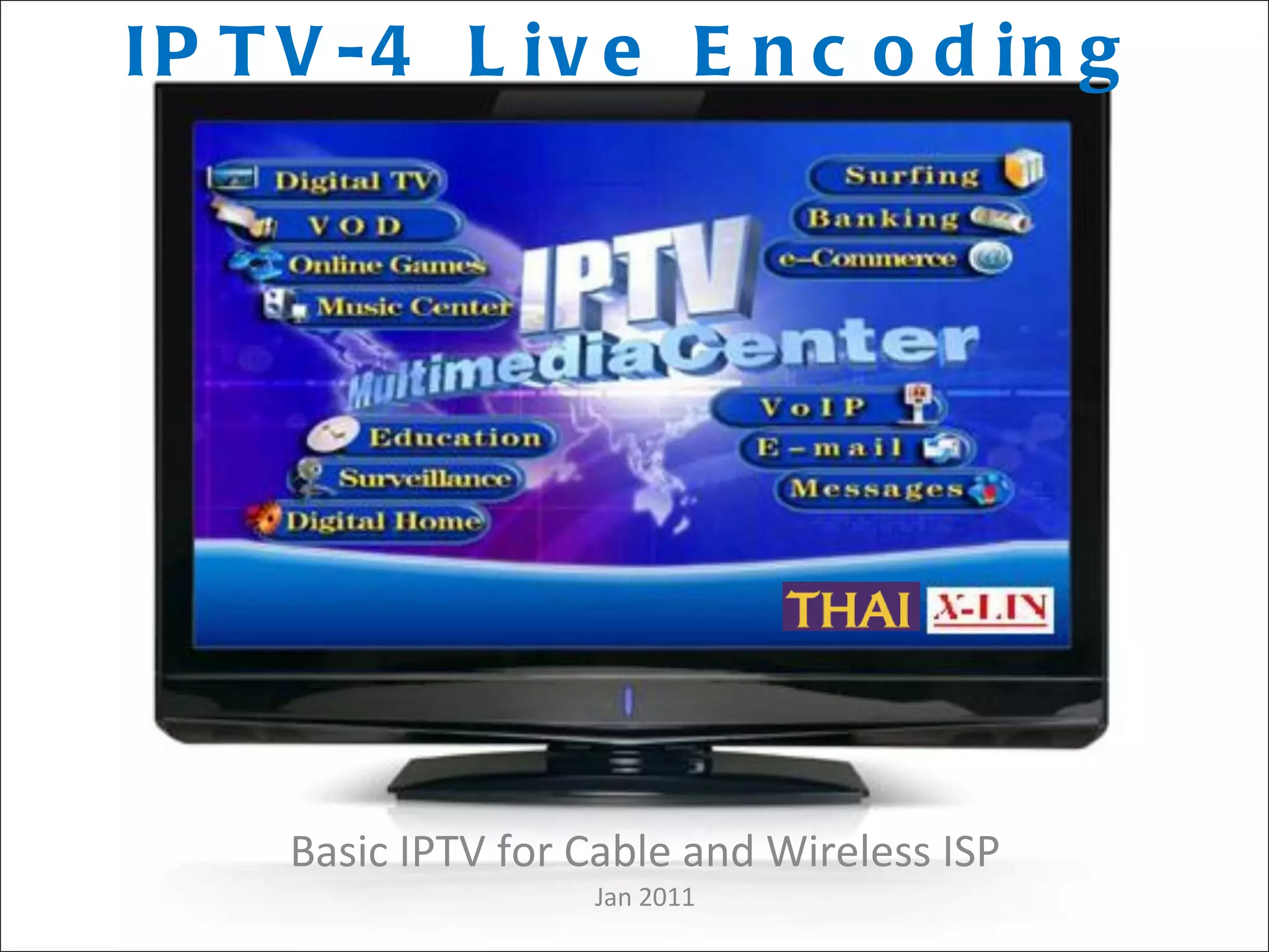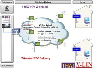 The document describes the x-lin 4-16/20 IPTV system, which is a 4-channel live streaming server capable of expanding up to 20 channels depending on bandwidth and storage. It includes a built-in 1TB hard drive with options for additional storage, and requires professional network configuration for operation. ISP operators are responsible for linking clients to the media server and can choose to arrange for custom web design at additional costs.