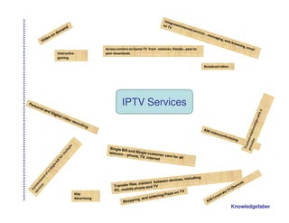 The IPTV India Progress Report by KnowledgeFaber, published in April 2009, analyzes the growth and challenges of IPTV services in India and globally. It highlights the rapid expansion of the IPTV market, particularly in countries like Hong Kong and France, while noting that Indian service providers such as BSNL and MTNL are early movers in this space. The report also identifies key inhibitors such as broadband penetration and quality of service that may affect IPTV's success in India.