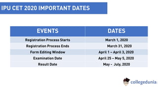 To apply for IPU CET 2020, candidates must follow a 4-step process: 1) Register by filling personal details from March 1-31, 2020; 2) Fill the application form with personal, academic, and qualification details; 3) Upload documents like photo and signature; 4) Pay the application fee of INR 1200 through online payment. Important dates include the exam from April 25-May 5, 2020 and result announcement from May-July 2020.