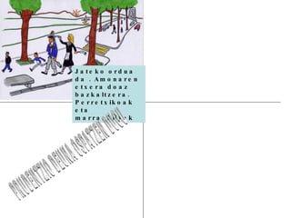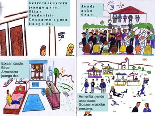 Ipuina 1. Retreta ikustera joango gara. Bihar Prudentzio Deunaren eguna izango da . Jende asko dago. Etxean daude. Bihar Armentiara joango dira. Armentian jende asko dago. Goazen eroskilar erostera. 2. Jateko ordua da . Amonaren etxera doaz bazkaltzera. Perretxikoak eta marraskiloak PRUDENTZIO DEUNA OSPATZEN DUGU