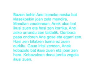 Bazen behin Aneizeneko neska bat klasekoekin joan zela mendira. Mendian zeudenean, Anek otso bat ikusi zuen eta hasi zen korrika. Ane asko urrundu zen taldetik. Denbora pasa ondoren Ane gose eta egarri zen. Hasi zen bilatzen baina ez zuen aurkitu. Gaua iritsi zenean, Anek kobazulo bat ikusi zuen eta joan zen hara. Kobazuloan dena jarrita zegola ikusi zuen.