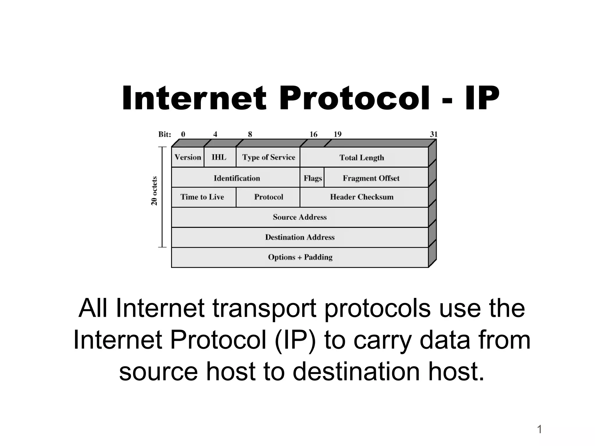 Internet Protocol (IP) is used to carry data from source to destination hosts across the Internet by providing addressing, fragmentation and reassembly, packet timeouts, and prioritization of traffic. IP uses 32-bit addresses to identify sending and receiving hosts and allows packets to be split into smaller fragments if needed to travel across networks. Routers use the IP Time to Live field to discard packets that have been traveling too long to prevent flooding of networks.
