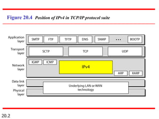 IPv4 is the delivery mechanism used by TCP/IP protocols to transmit data in packets called datagrams. It is an unreliable, connectionless protocol that does not guarantee delivery and provides no error or flow control. IPv4 operates at the host-to-host network layer and uses a datagram approach for packet switching networks. Address Resolution Protocol (ARP) maps logical IP addresses to physical hardware addresses to allow communication between hosts on the same local area network. ARP uses broadcast for requests and unicast for replies.