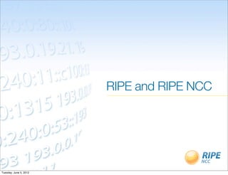 This document discusses IPv4 depletion and IPv6 deployment. It provides background on RIPE and the RIPE NCC, including their roles in managing IP addresses. It notes that the global pool of IPv4 addresses is nearly depleted while adoption of IPv6 is still low. The document outlines policies and best practices for obtaining IPv6 allocations and assignments from RIPE, and creating an effective IPv6 addressing plan to support future growth and migration.