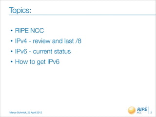 The document discusses the current status and distribution of IPv6 deployment by RIPE NCC, highlighting the transition from IPv4 due to address depletion. It outlines allocation policies, current IPv6 address statistics, and the requirement for organizations to obtain IPv6 allocations. The speaker encourages immediate action for IPv6 transition, emphasizing that avoiding the issue is not viable for continued networking growth.