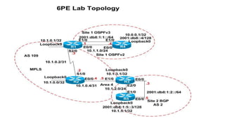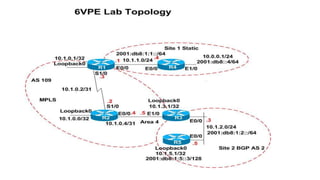 The document outlines an IPv6 hands-on lab session led by Cisco technical leaders, providing training on configuring, troubleshooting, and implementing IPv6 networks. Participants will learn about various IPv6 technologies, including addressing, routing protocols, and stateful/stateless configurations, while working through a practical lab environment to understand dual stack and tunneling techniques. The lab agenda includes multiple tasks dealing with IPv6 setup and verification across different scenarios in a network.