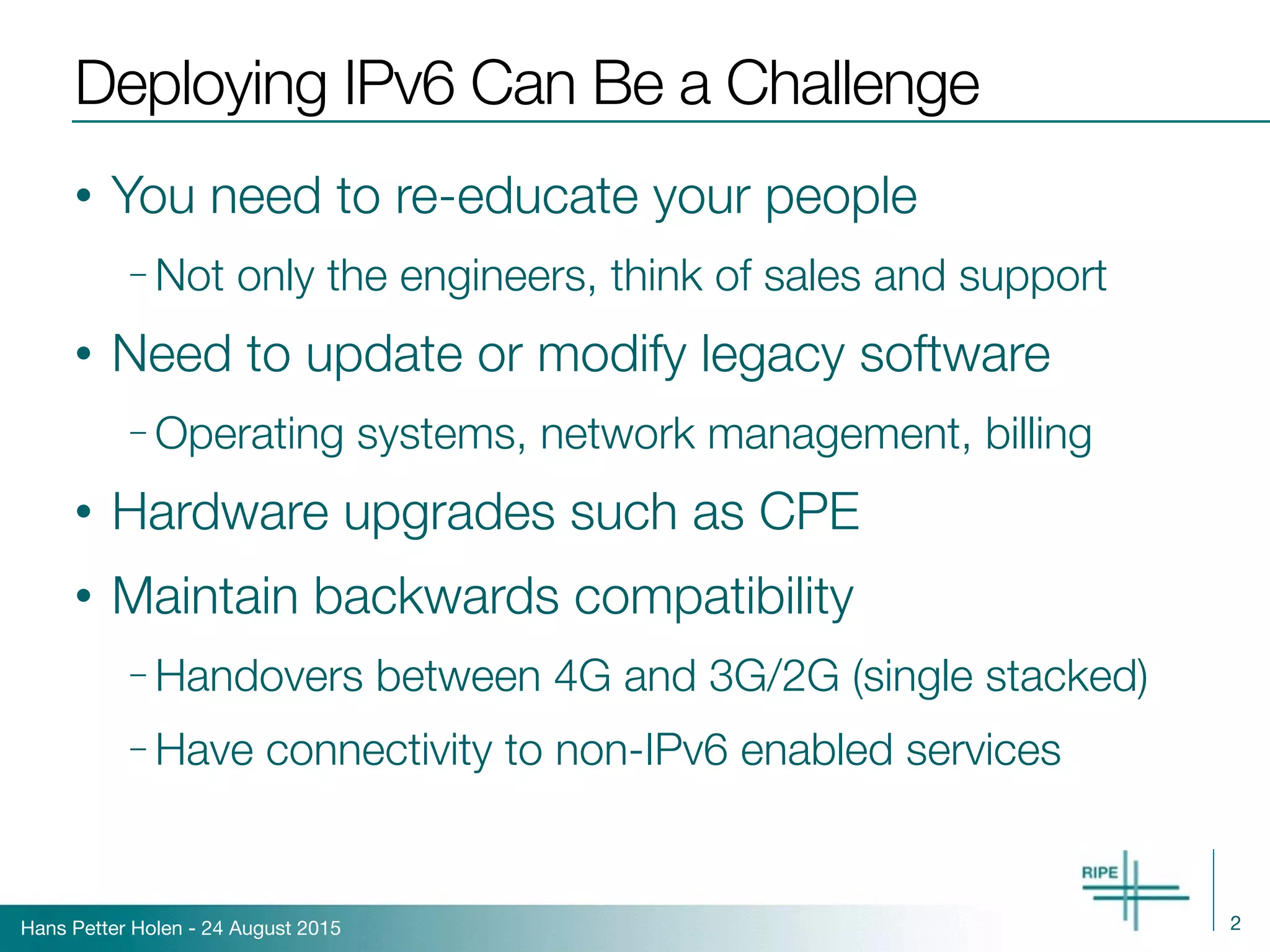 This document discusses challenges and progress with IPv6 deployment. It notes that deploying IPv6 can require retraining staff, updating legacy software and hardware, and maintaining IPv4 compatibility. Some countries and networks have made progress, with over 40% deployment in Belgium, Switzerland, and China Unicom. Leading ISPs like Comcast and Deutsche Telekom have over 30% of customers using IPv6. In Norway, Telenor leads with around 10% deployment, while public sector sites still lack IPv6 support. The document calls for coordination between ISPs and the public sector to further encourage IPv6 adoption.