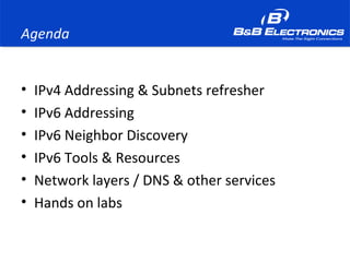 This document provides an agenda and overview for an IPv6 networking training session. The summary includes:
