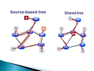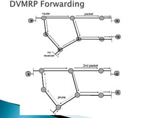 Routing protocols exchange information to determine the best paths between sources and destinations in a network. The document discusses several routing protocols: