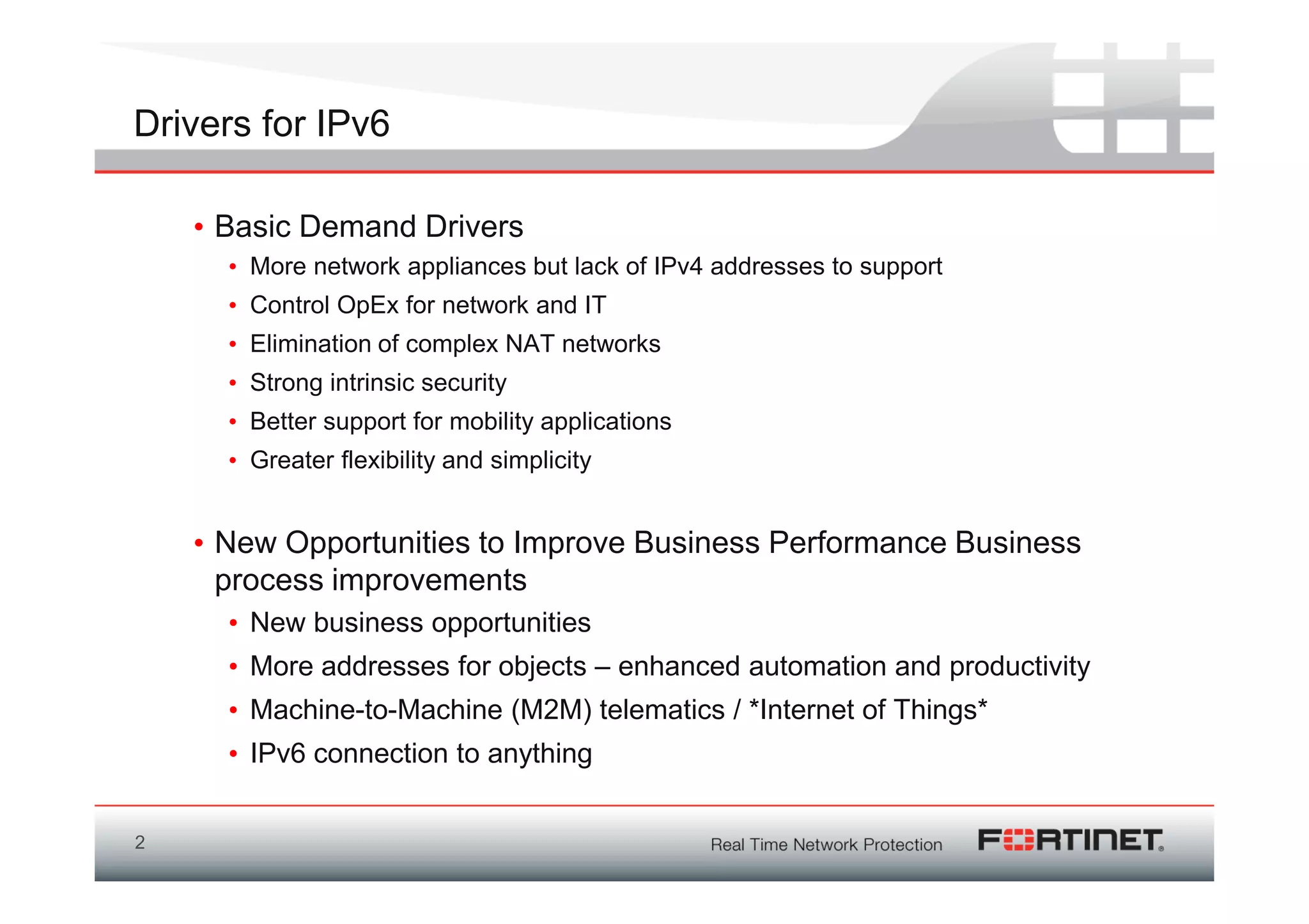 The document discusses the transition to IPv6 due to the exhaustion of IPv4 addresses, outlining the benefits of IPv6 including a larger address space, improved security, and better support for modern applications. It highlights the complexities and considerations involved in the migration, such as compatibility issues and the necessity of dual-stack systems. Additionally, it presents Fortinet's strategies for integrating IPv6 capabilities into their security features and emphasizes the importance of planning and infrastructure readiness for successful implementation.