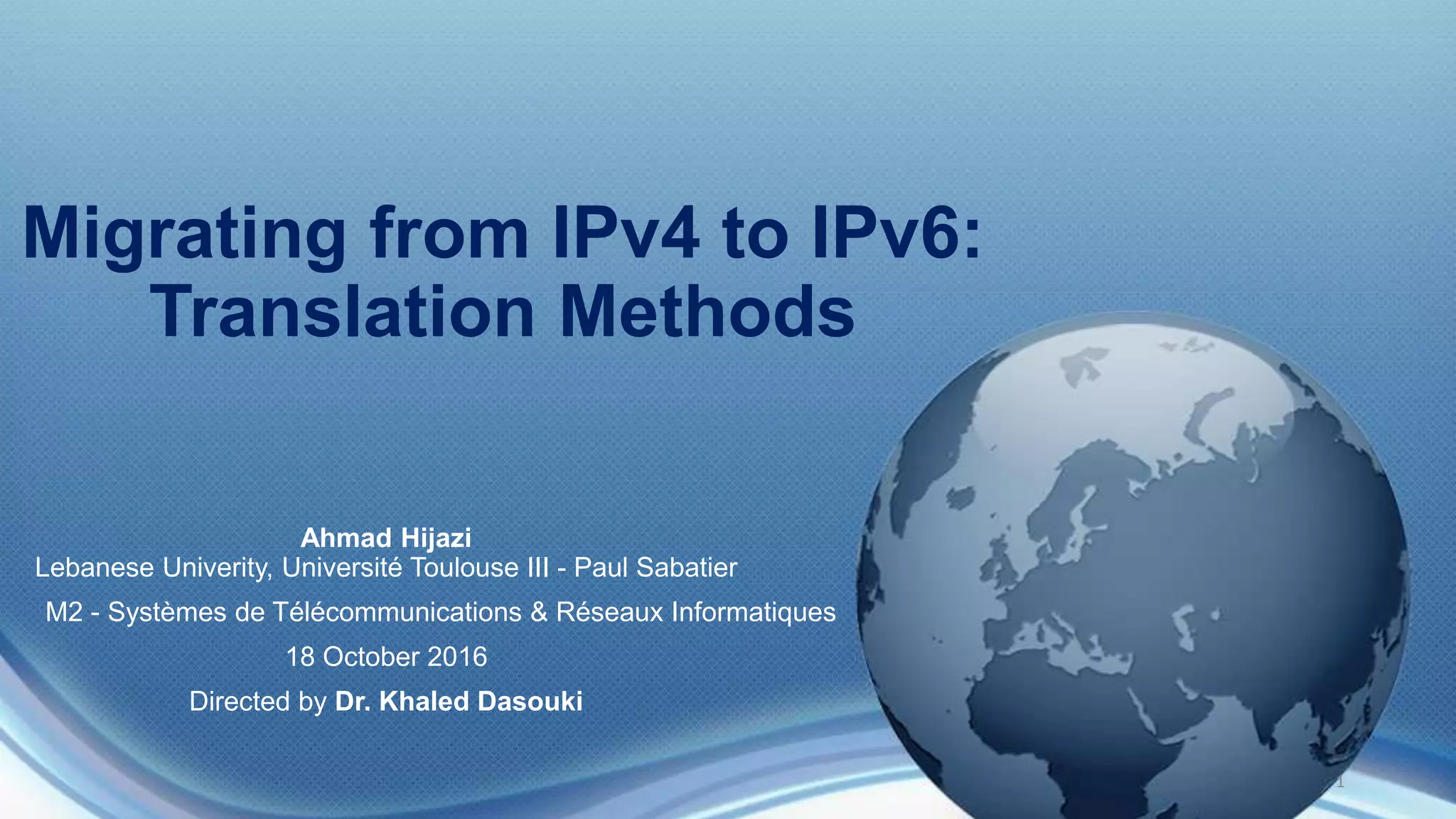 The document discusses several methods for migrating from IPv4 to IPv6 including native dual stack, DS-Lite, NAT64, and 6RD. Native dual stack allows simultaneous use of IPv4 and IPv6 but is the most complex to deploy. DS-Lite tunnels IPv4 packets over IPv6 to allow an IPv6-only access network. NAT64 provides IPv4-IPv6 translation to allow access to IPv4 servers from an IPv6 network. 6RD allows lightweight IPv6 deployment without upgrades by encapsulating IPv6 in IPv4. Each method has different impacts on the access network, subscriber edge, and home network domains.