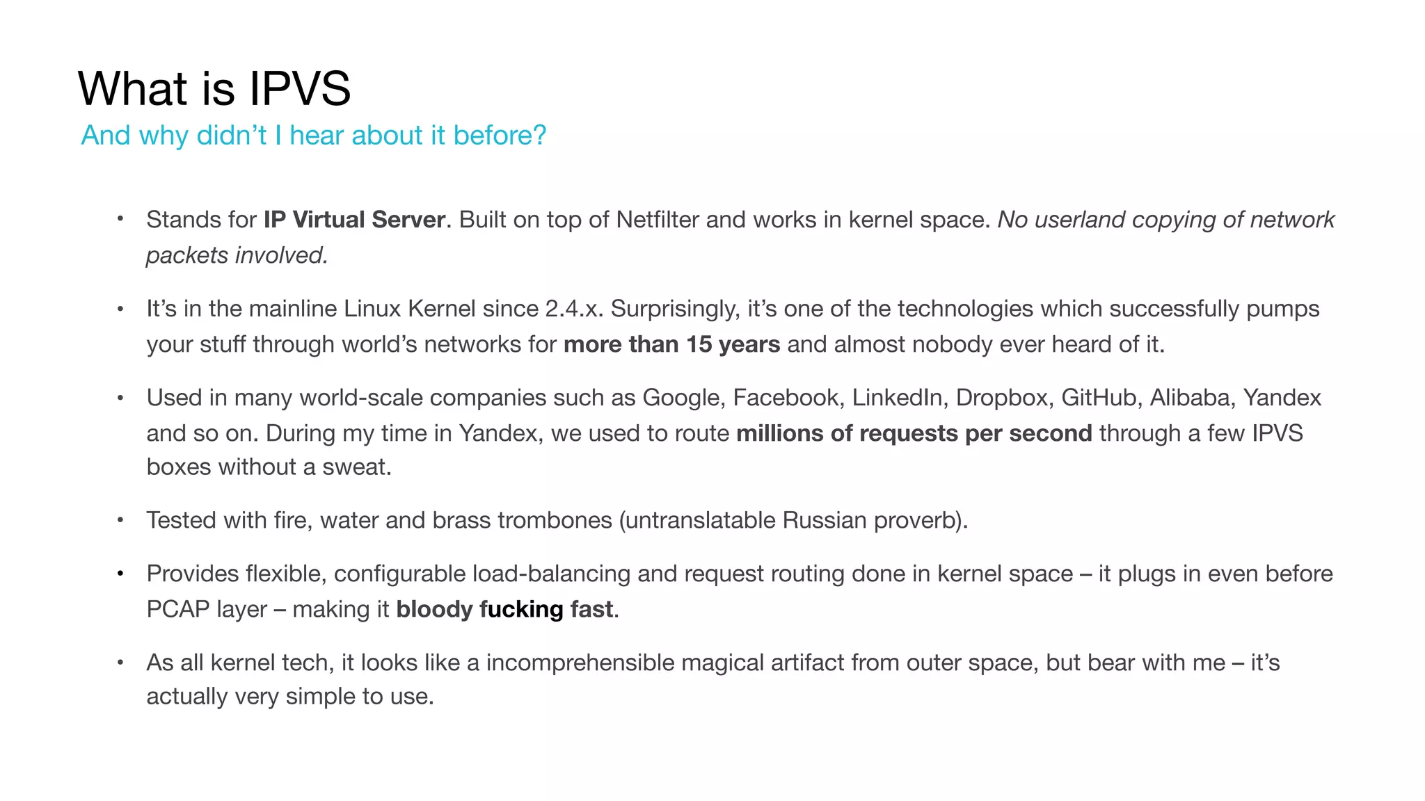 This document discusses IPVS (IP Virtual Server), a kernel-level load balancing and request routing technology built into the Linux kernel. It has been used by major companies like Google, Facebook, and Yandex to route millions of requests per second. The document introduces some key features of IPVS, including different forwarding methods (DNAT, DR, IPIP), load balancing algorithms, health checks, and cluster synchronization. It then describes GORB, an open-source REST API and daemon that can configure and manage IPVS from userspace without restarting services. GORB potentially makes IPVS useful for load balancing Docker containers dynamically as containers are started and configured.