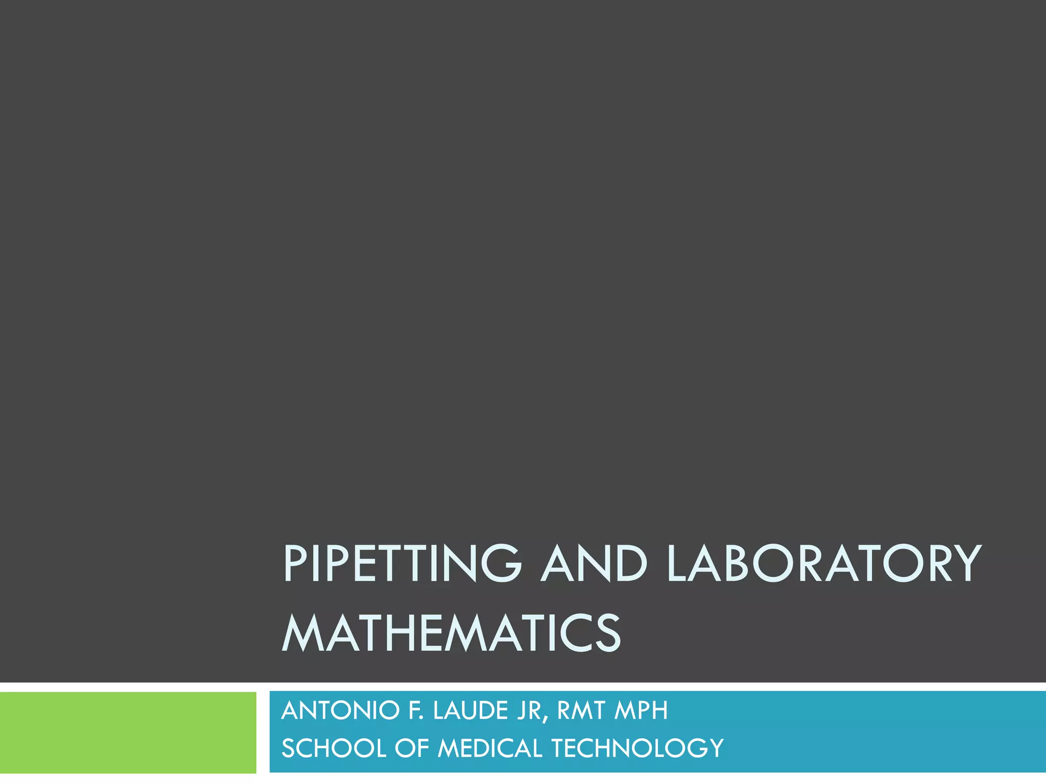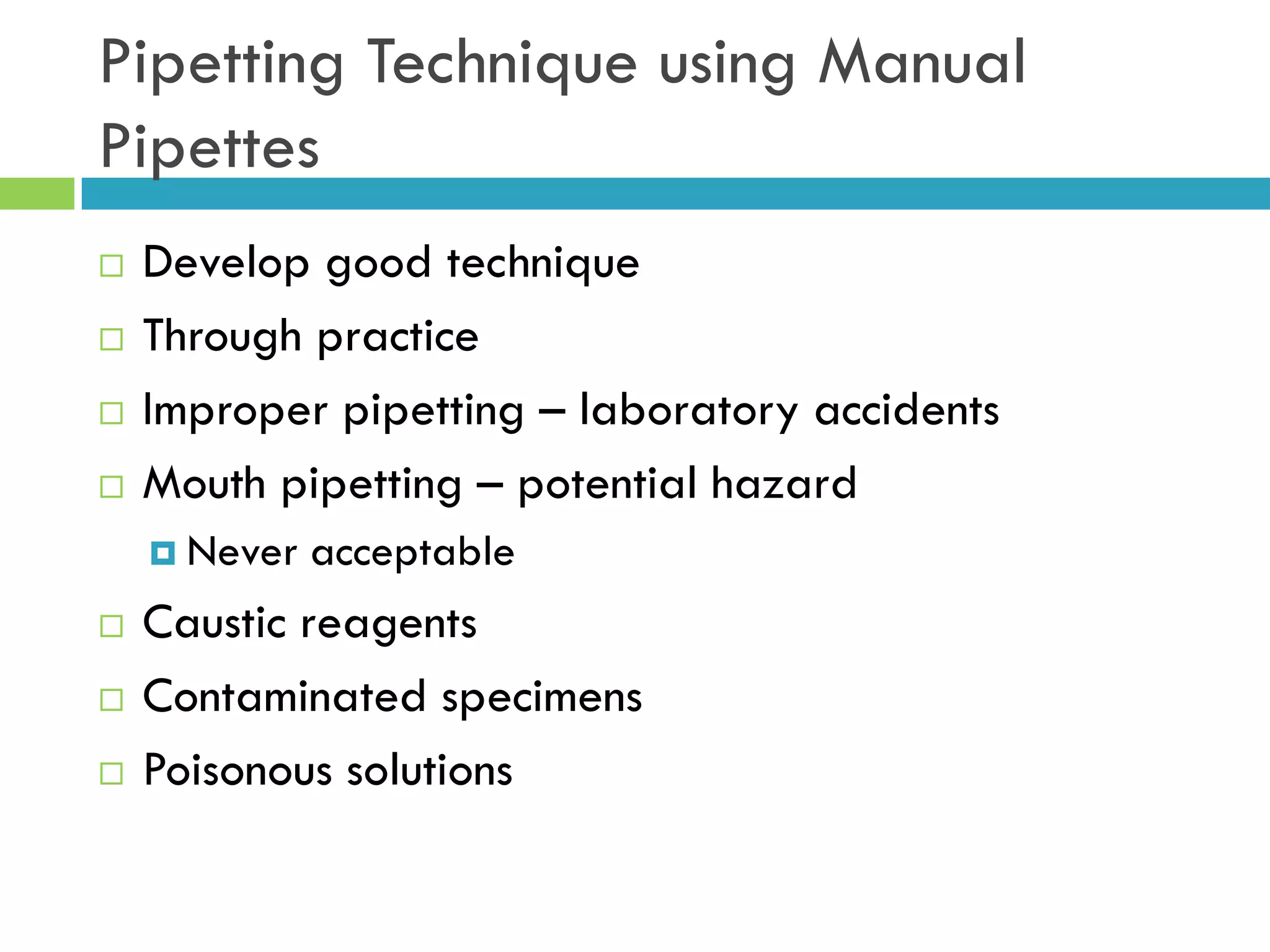 This document provides instructions on proper pipetting techniques using manual pipettes and automatic micropipettors. It discusses developing good pipetting skills through practice to avoid accidents. It also covers pipetting steps, reading the meniscus, diluting solutions, and performing calculations related to molarity, normality, milliequivalents, and dilution factors.