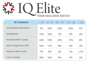 This document discusses intelligence and IQ. It defines intelligence as the ability to reason, plan, solve problems, think abstractly, comprehend ideas, learn, and use language. IQ is defined as a measurement of intelligence compared to others. The document discusses criticisms of IQ tests but argues they accurately measure a general cognitive ability and correlate with academic and professional success as well as income and wealth. It summarizes research showing intelligence is influenced by both genetics and environment and differs between racial groups on average, though with significant overlap between groups.