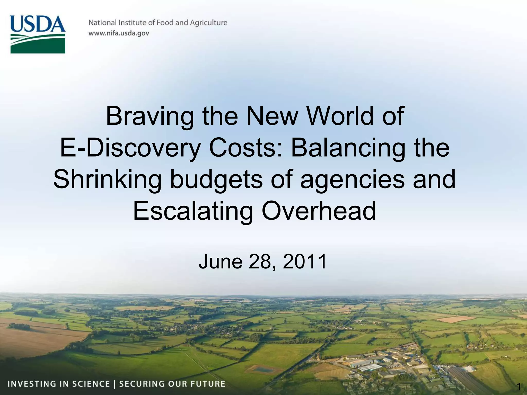 This document discusses the challenges of e-discovery for organizations facing litigation. It notes that e-discovery costs are high and increasing due to growing volumes of electronically stored information (ESI) and more regulations. The document advocates adopting proactive information governance practices rather than reactive approaches to reduce e-discovery costs over time. It provides an electronic discovery reference model and recommends determining an organization's litigation and risk profile, understanding where ESI is located, and right-sizing e-discovery solutions to needs.