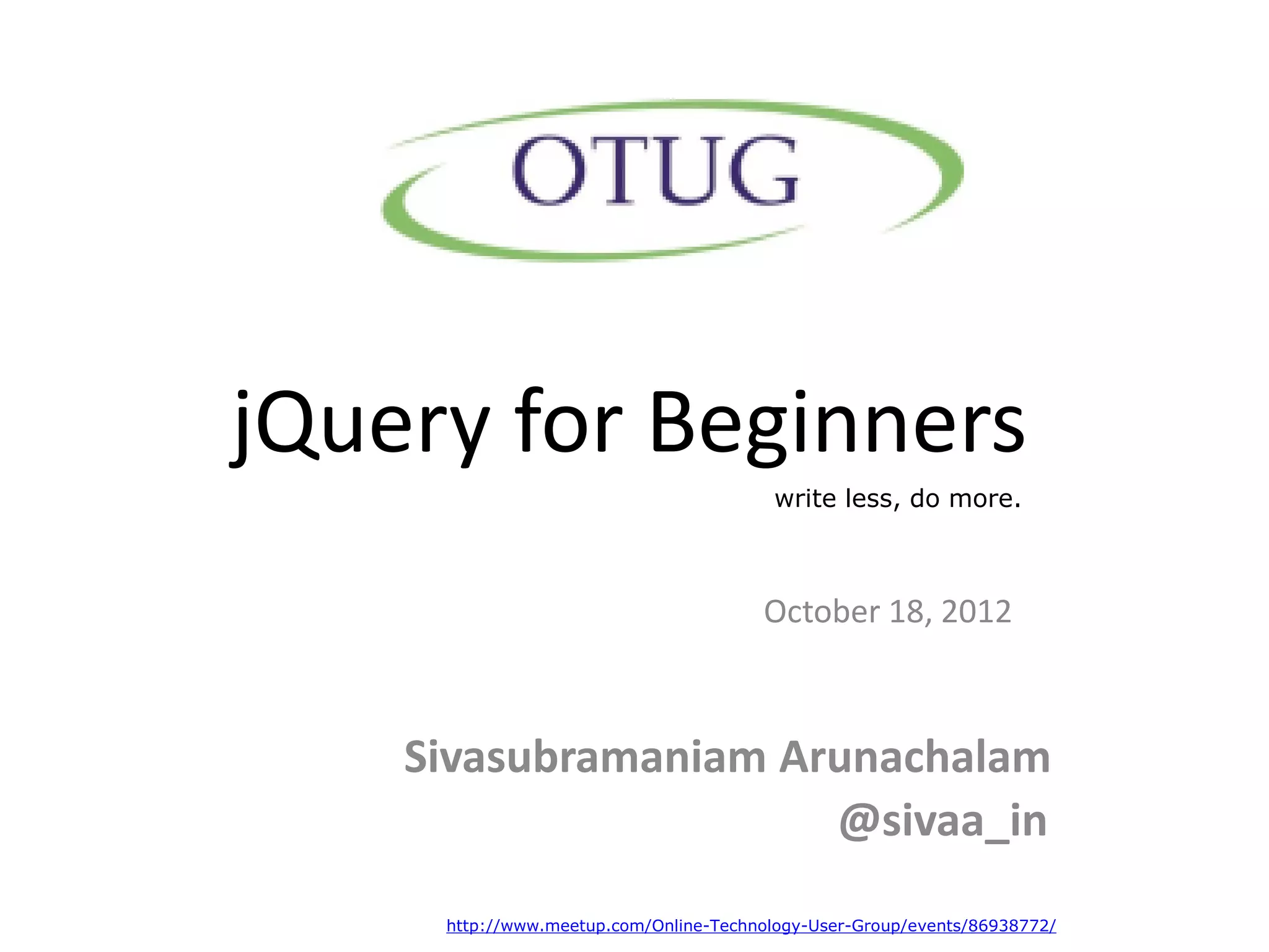 This document provides an introduction to jQuery for beginners. It discusses jQuery's history and benefits, how to download and include jQuery, basic selectors and filters, traversing elements, basic events and animations, jQuery UI libraries, AJAX functionality, and compares jQuery to other JavaScript frameworks. The presentation aims to explain jQuery concepts at a high level without being a tutorial or reference guide. It includes code examples throughout to demonstrate jQuery syntax and methods.