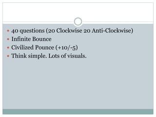 The document contains a 40 question quiz with visuals on various topics ranging from architecture, movies, history, science and more. It includes questions about the Genbaku Dome in Hiroshima, a tennis player who hit a record serve, the nickname of Holy Roman Emperor Frederick I, and the inspiration for the Tower of Babel. Various answer options are provided in visual form on subsequent slides.