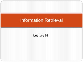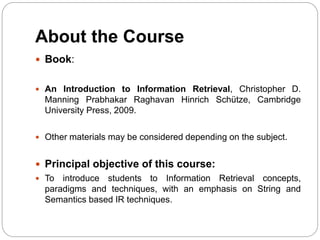 This document provides an overview of an information retrieval course. The course will cover topics related to information retrieval models, techniques, and systems. Students will complete exams, assignments, and a major project to build a search engine using both text-based and semantic retrieval techniques. The document defines key concepts in information retrieval and discusses different types of information retrieval systems and techniques.
