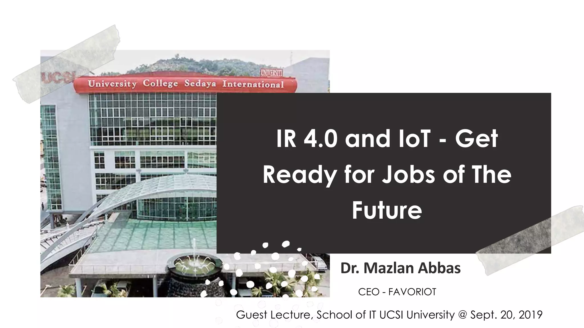 The document discusses Industrial Revolution 4.0 (IR 4.0) and the Internet of Things (IoT). It begins with an overview of IR 4.0 and the key technologies enabling it like artificial intelligence, robotics, drones, etc. It then discusses the barriers to adopting IR 4.0. The next section focuses on IoT, explaining how it has grown from a ripple to a tsunami. It outlines the phases of IoT maturity and discusses business model transformations with IoT. The document concludes by discussing important areas of the IoT value chain and the traits needed for the new generation of IoT leaders.