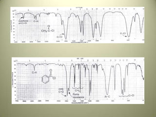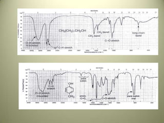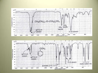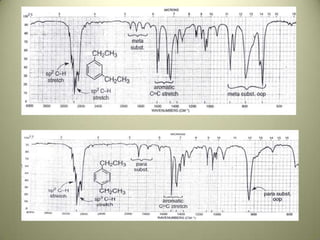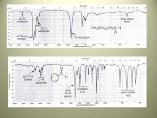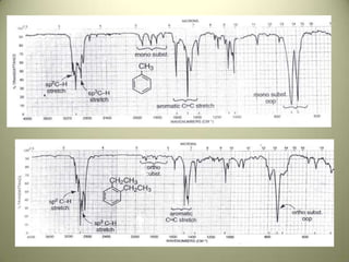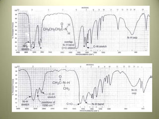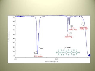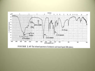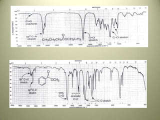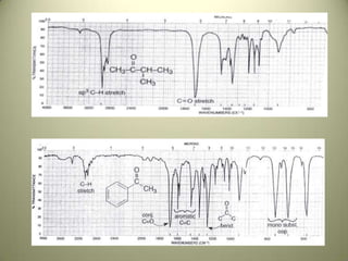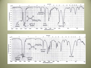 The document discusses sample handling and interpretation of infrared spectroscopy. It describes several methods for preparing solid, liquid, and gas samples for IR analysis. These include pressed KBr pellets for solids, liquid samples in thin films between windows, and gases in cells. The document then outlines how to interpret IR spectra by identifying key functional groups like carbonyl, hydroxyl, aromatic, and C=C bands. It provides examples of infrared absorptions for several classes of organic compounds including alkanes, alkenes, alcohols, ketones, and amides.