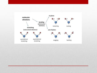The document provides an overview of infrared (IR) spectroscopy, discussing its theory, modes of vibration, and various instrumentation used for measurements. It explains the electromagnetic spectrum range of IR, the significance of Hooke’s law in molecular vibrations, and details different types of IR spectrometers and their components. Additionally, it covers sample preparation techniques for solids, liquids, and gases, as well as the classification of detectors used in IR spectroscopy.