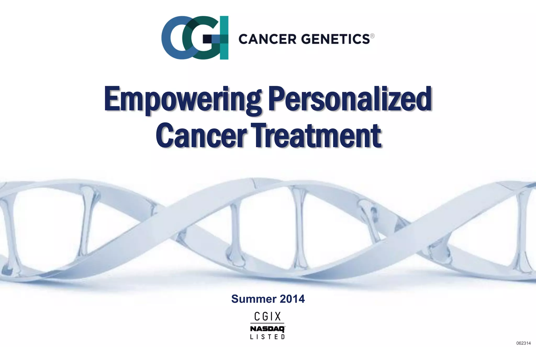 Cancer Genetics provides personalized cancer treatment through molecular diagnostic testing. They have launched 6 proprietary diagnostic products targeting hematological and urogenital cancers. Their tests help determine cancer type and prognosis, guiding treatment selection. Recent acquisitions expand their capabilities and access to new markets in India. Their business model provides clinical testing services to oncologists and biopharma partnerships to support drug development.