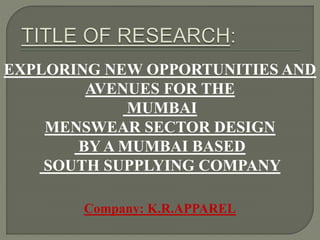 The document discusses a study conducted by 5 students for a Mumbai-based menswear company, K.R. Apparel, to help them launch in the Mumbai market. The study included surveying retail brands and consumers in Mumbai to understand preferences. Key findings were that formal and semi-formal shirts in natural fabrics with fancy pockets would be preferred. Color and trend predictions for summer 2012 were also analyzed to develop a new collection for K.R. Apparel's Mumbai launch.