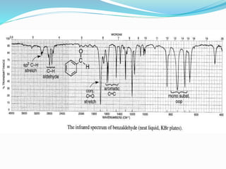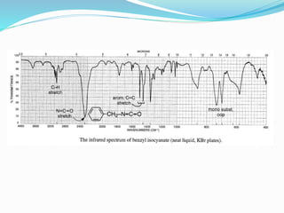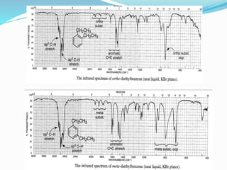 The document discusses the applications and principles of infrared (IR) spectroscopy, including its use for the identification and structure determination of various organic compounds and functional groups. It covers methods such as qualitative and quantitative analysis, the study of hydrogen bonding, conformational analysis, and the detection of impurities. Additionally, the document details specific IR absorption ranges for various organic compounds, including alkanes, alcohols, ketones, and carboxylic acids, highlighting the factors that influence their spectral characteristics.