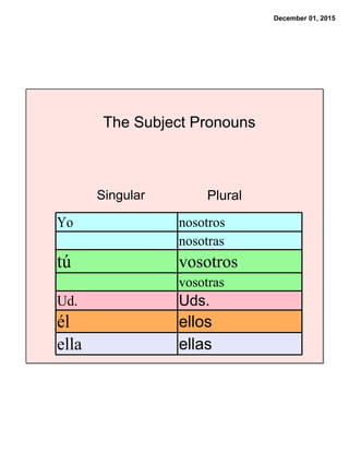 The document provides information on Spanish verb conjugation and grammar structures. It includes conjugation tables for -ir verbs like abrir, cubrir, and vivir. It also discusses using the infinitive form after another verb when the subject does not change, such as "Tú necesitas comprar pan," and forming negative sentences and questions. Examples are given of conjugate verbs, infinitives, negatives, and questions.