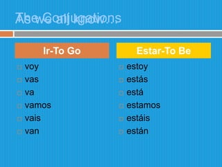 This document provides an overview of the uses of the verbs "ir" and "estar" in Spanish. It explains that "ir" is used to talk about going to or from places, as well as future actions. Examples include asking where someone is going, what they will do, or if they will go somewhere. "Estar" is used to express emotions, feelings, and locations. It gives examples like describing how someone feels, stating where something is located, or asking how someone feels emotionally. The document aims to explain the basic uses and conjugations of these important Spanish verbs.