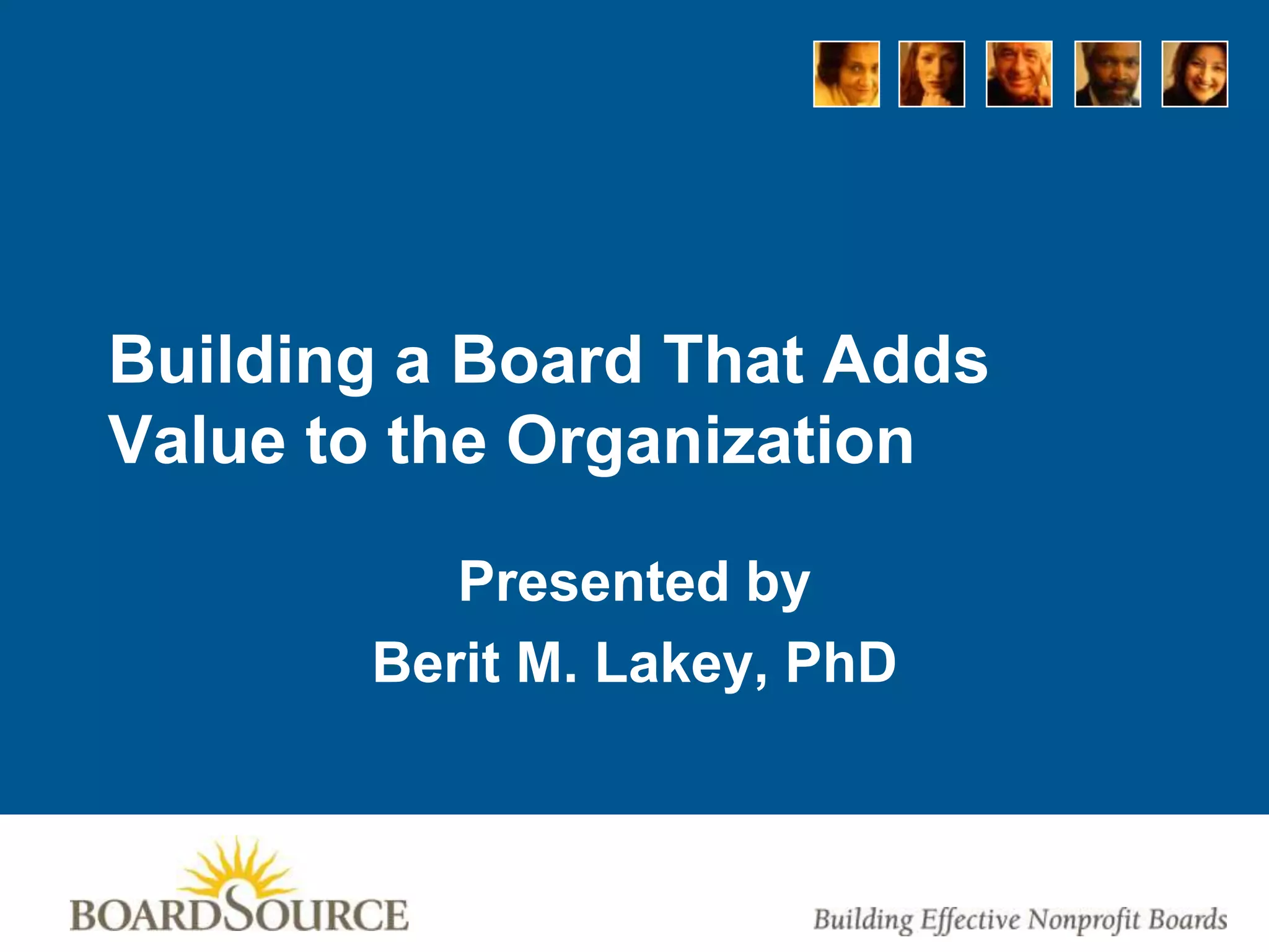 This document discusses best practices for building an effective nonprofit board that adds value to the organization. It covers establishing shared understanding of board roles and responsibilities, clarifying the roles of the board and CEO, identifying structures and practices that enhance board effectiveness, and developing board governance. Specific topics include establishing strategic direction, ensuring resources, providing oversight, the board-CEO partnership, high-performance board meetings and structures, and ongoing board development. The overall message is that a well-functioning board can actively engage in governance and strategic guidance to further the organization's mission.