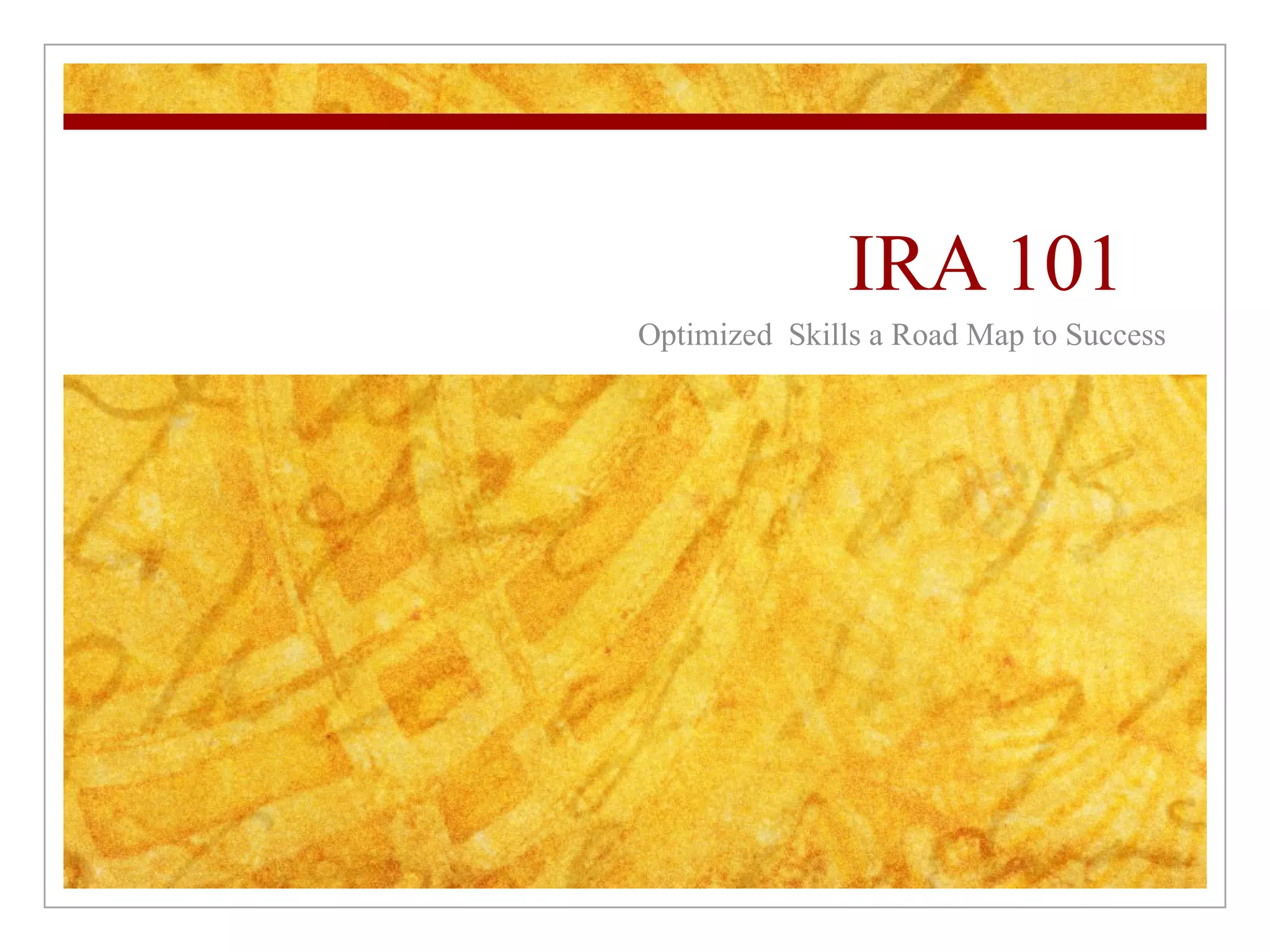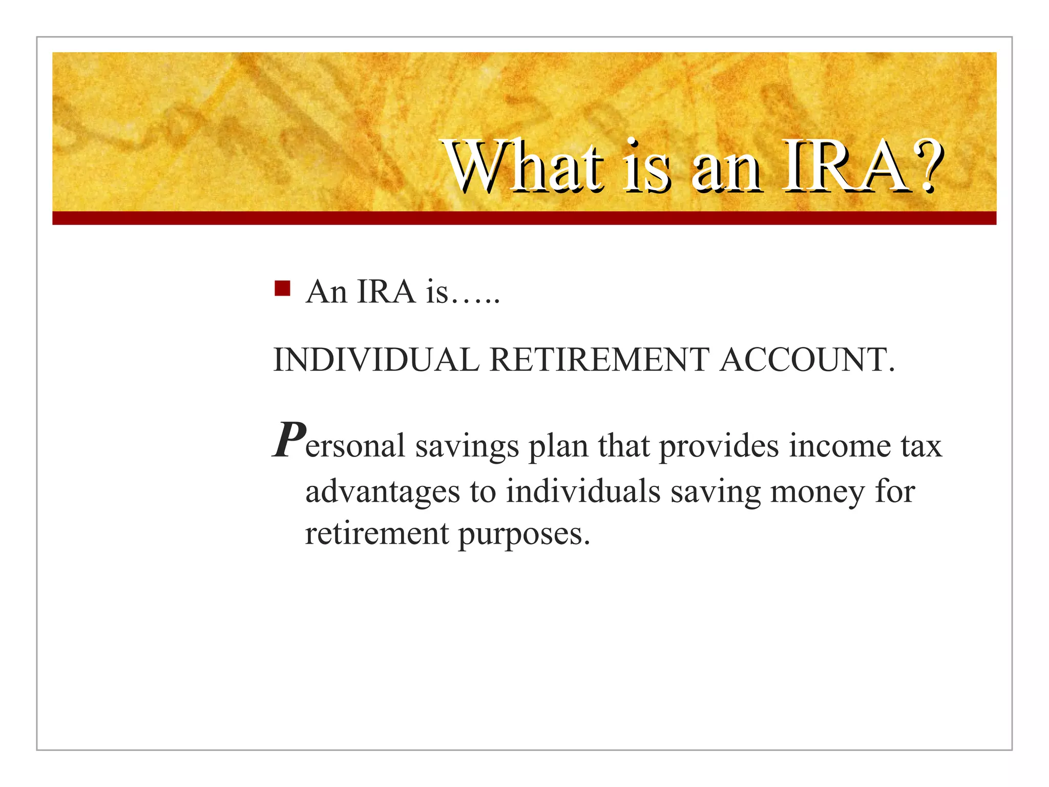The document discusses different types of individual retirement accounts (IRAs) including traditional IRAs, Roth IRAs, SEP IRAs, SIMPLE IRAs, and Coverdell Education Savings Accounts. It provides information on contribution limits, tax treatment, eligibility, and key features of each type of IRA. The document is intended to help explain the different IRA options available for retirement savings.